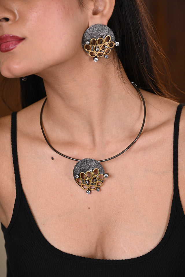 Radiate bold elegance with our Celestial Hive Fusion Set, featuring a statement choker necklace and matching earrings. Designed with a striking fusion of matte black texture and golden honeycomb motifs, this set captures the essence of modern artistry.