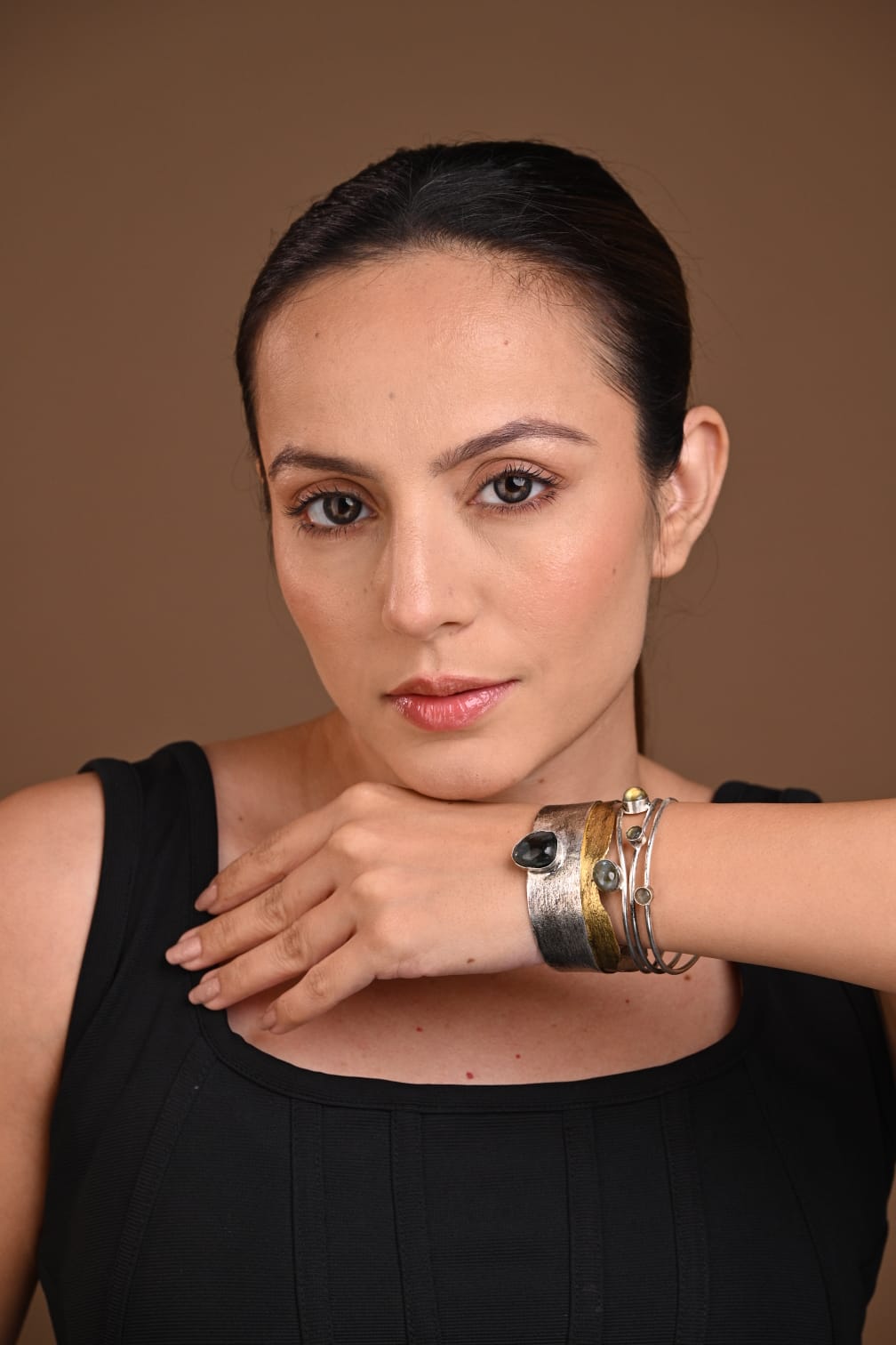 The Jhil Mil Handcuff blends oxidised silver, antique gold, and semi precious stones all fused into one bold cuff that does the layering for you.