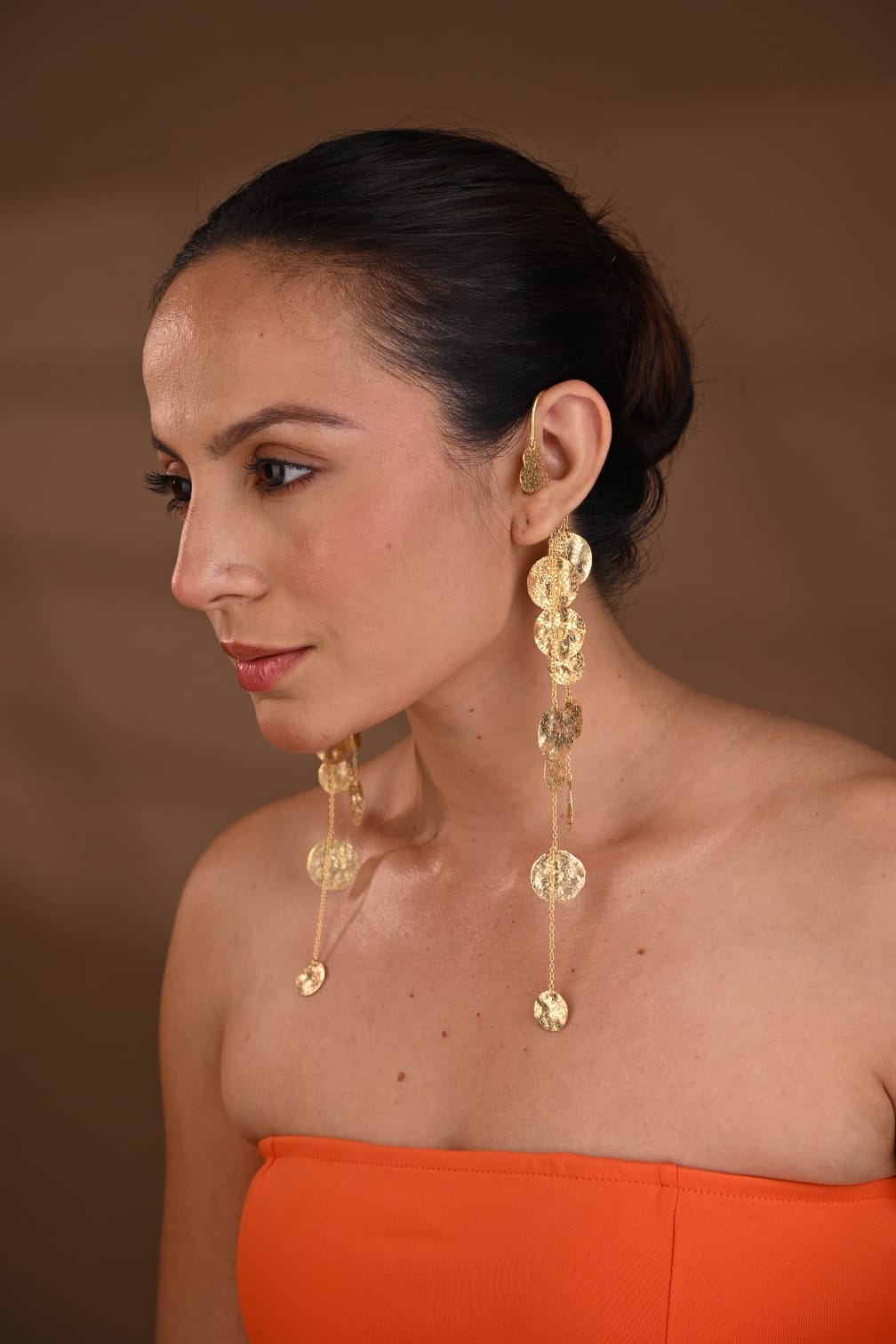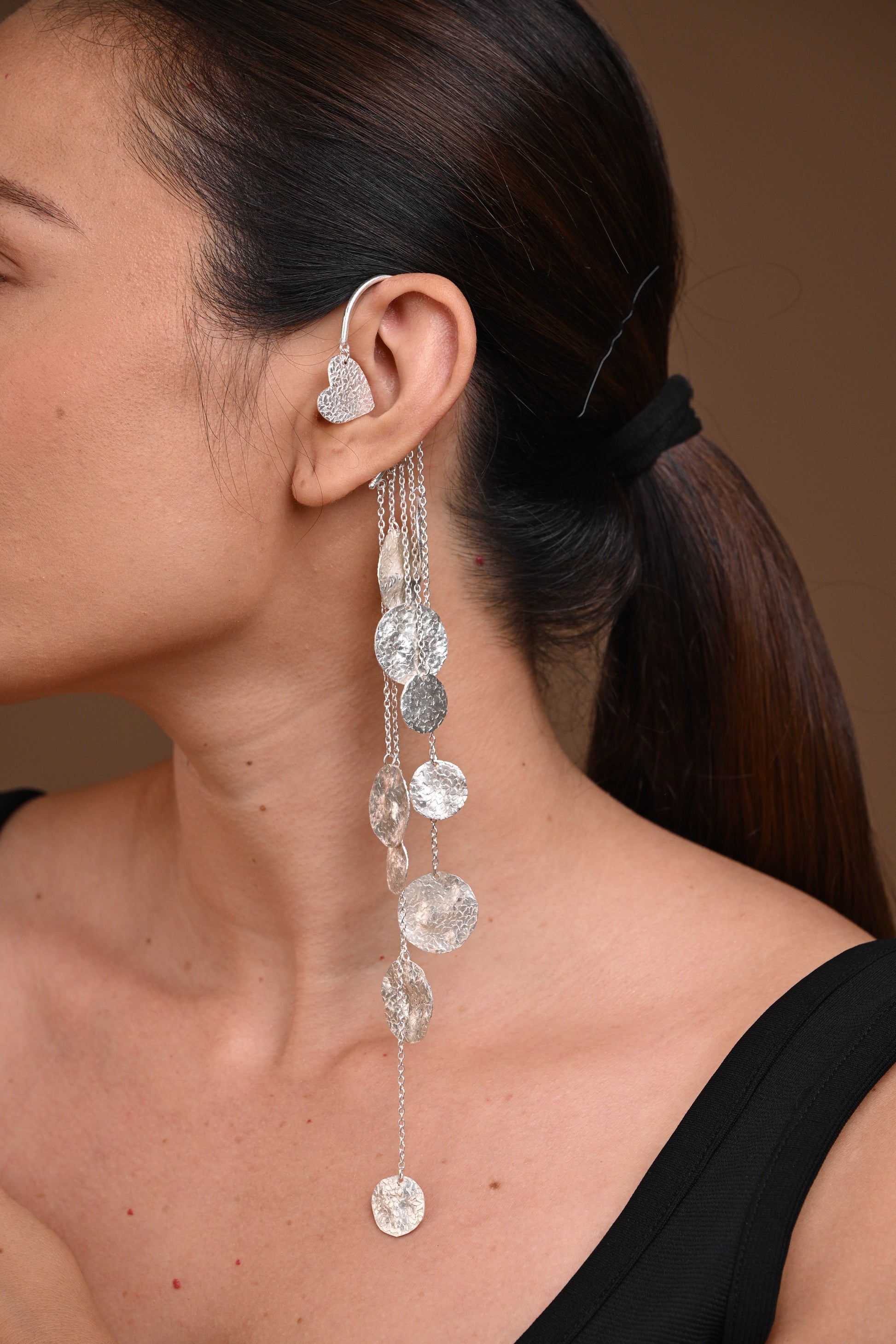 A single statement earcuff featuring cascading hammered coins. Designed to hang softly, shimmer boldly, and turn heads effortlessly.