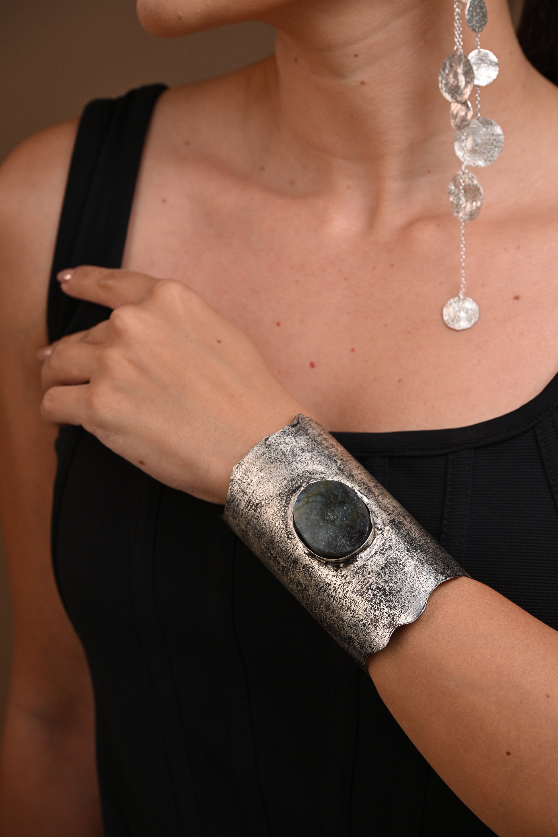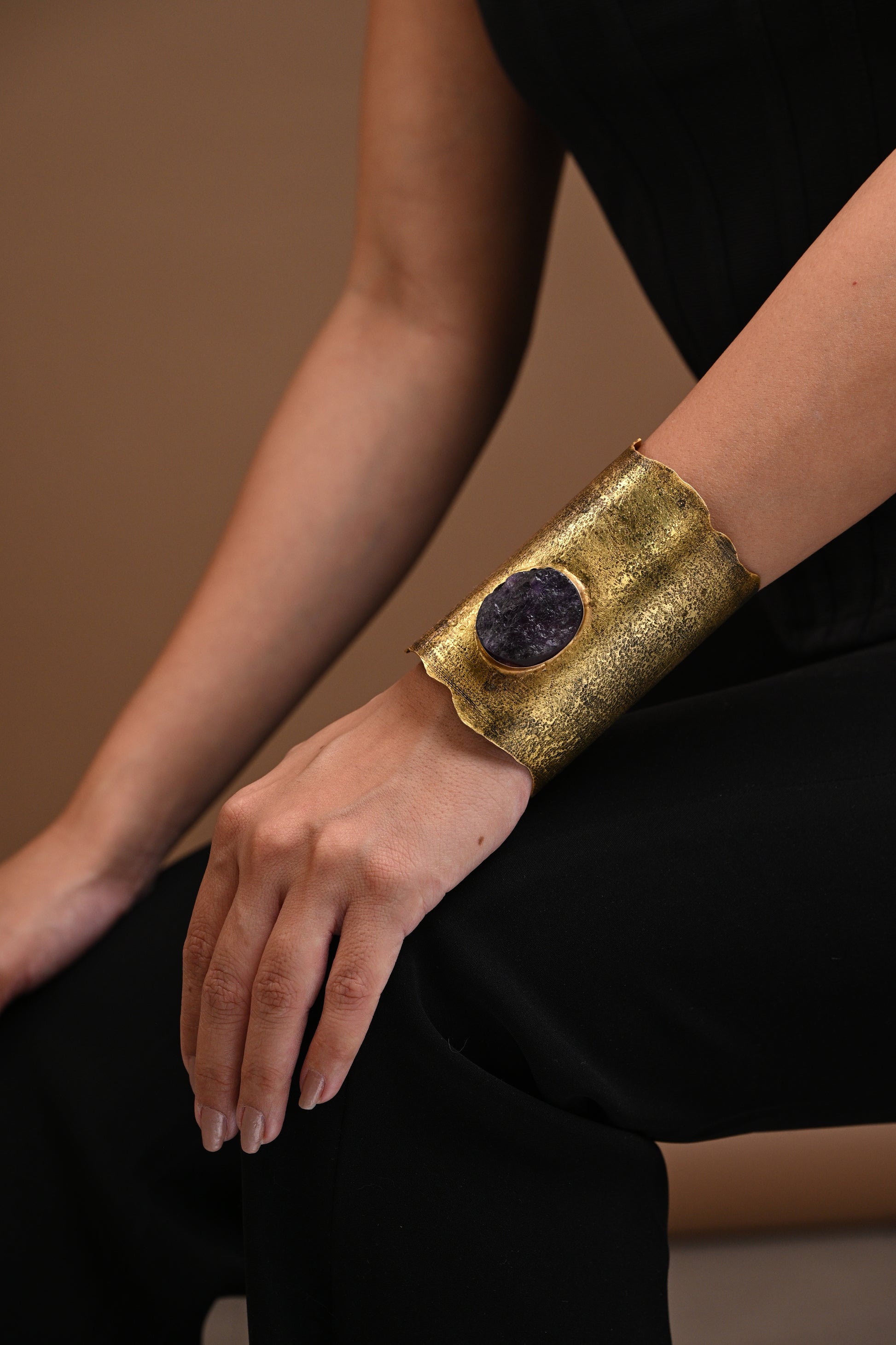 The Nayab Handcuff features a textured finish and a raw cut semi-precious stone a piece that adds drama to any look, day or night.