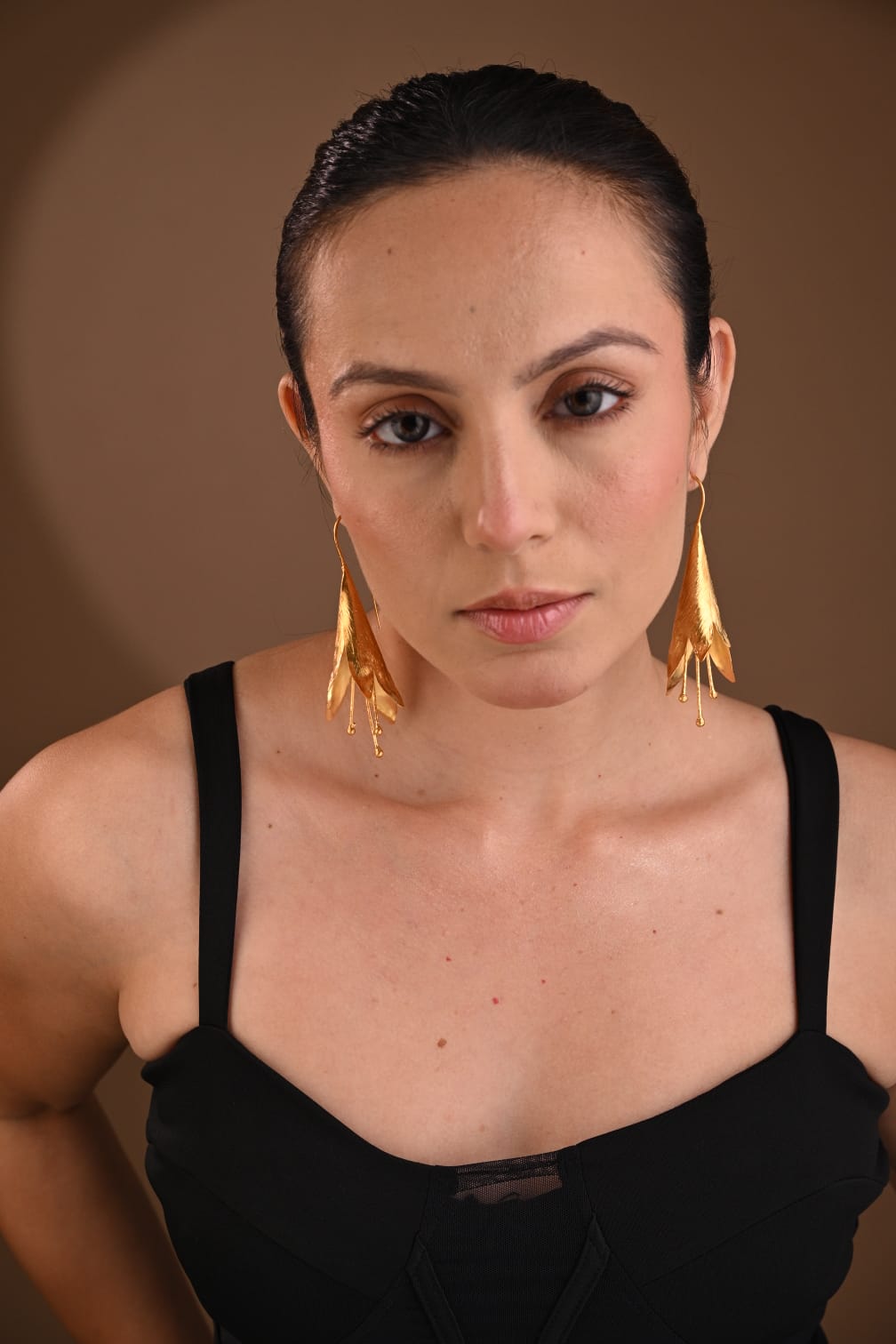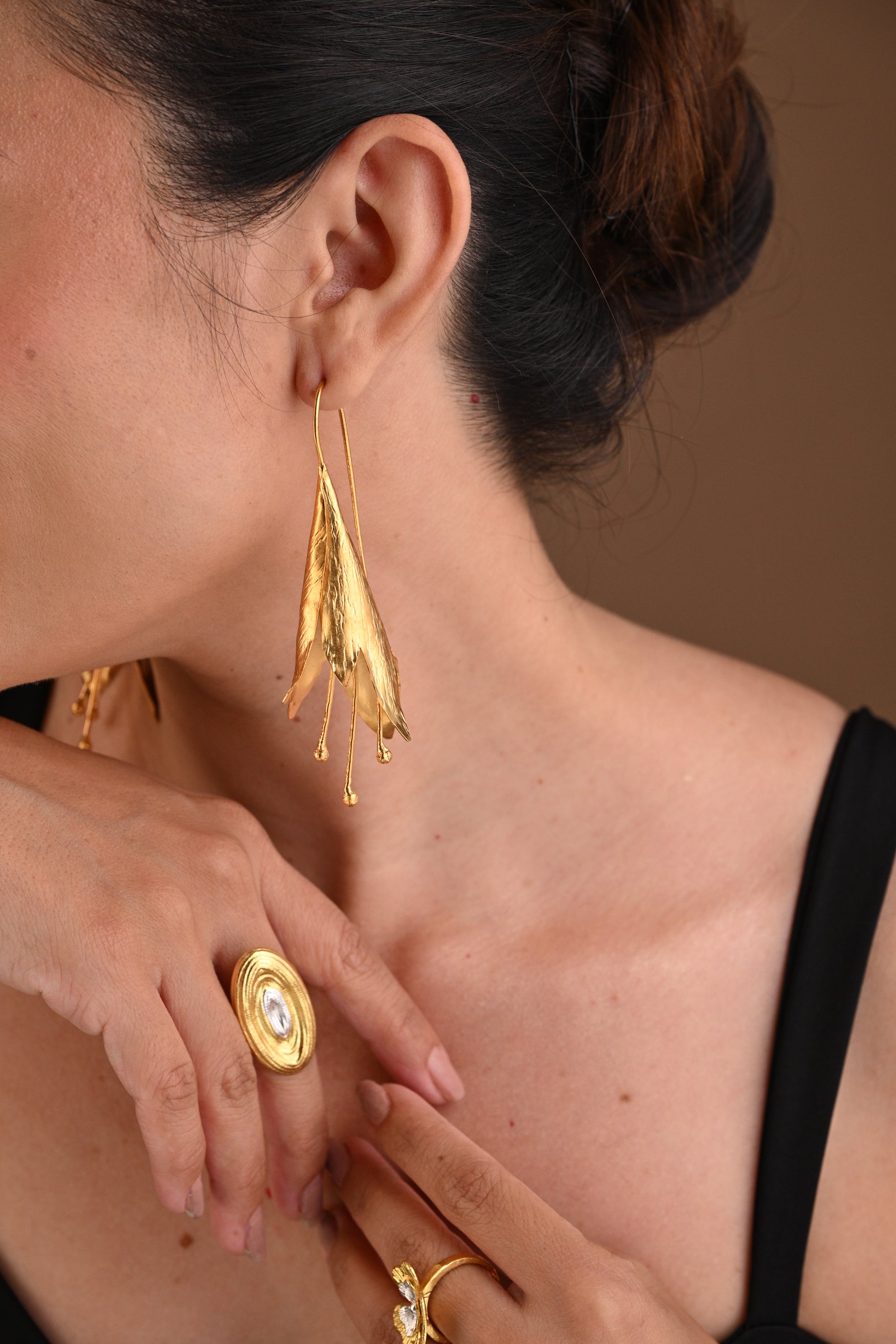 The Phulkari Earrings bring a sculpted botanical touch detailed with hammered petals and delicate dangling ends for graceful drama.